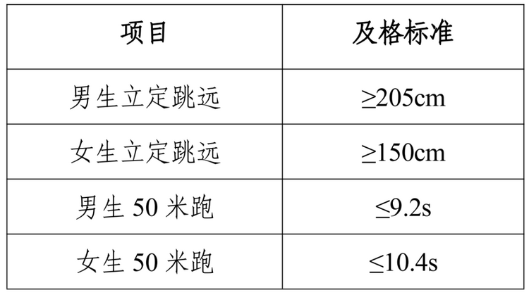 3. 考生需参加由中山大学组织的体质测试,测试项目可自主选择立定跳远或50米跑。体质测试不受理缓考、补考申请。体质测试及格标准如下: