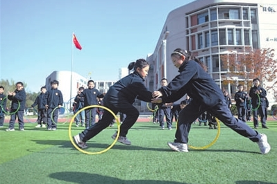 11月28日,在位于南京市鼓楼区的天妃宫小学,学生在上体适能课。