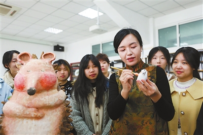 在嘉兴大学平湖师范学院陶艺工作室,嘉兴大学陶艺教育团队负责人李文娟老师为学生现场演示陶瓷釉下彩技法。