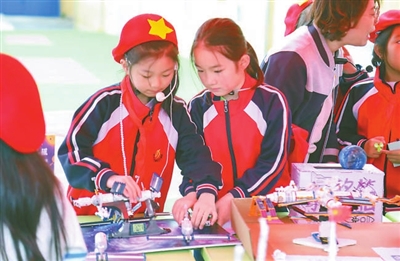 黑龙江省哈尔滨市继红小学科技大集上,学生协作调试航天模型作品。学校供图
